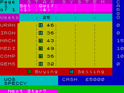 Существует более 15 звездных систем, хотя вам не нужно, чтобы начать с этим многие. Ваш корабль может нести шесть товары; Уран, железная руда, машины, Медицинские расходные материалы, компьютеры и драгоценных камней. Дисплей показывает, для каждого звездной системе в игре, покупки и продажи цен на эти товары. Звезда-система будет либо купить или продать товар, не оба одновременно. Расстояние от ваше текущее положение в Галактике от всех других систем показано, как это распечатка вашего Текущее состояние груза.