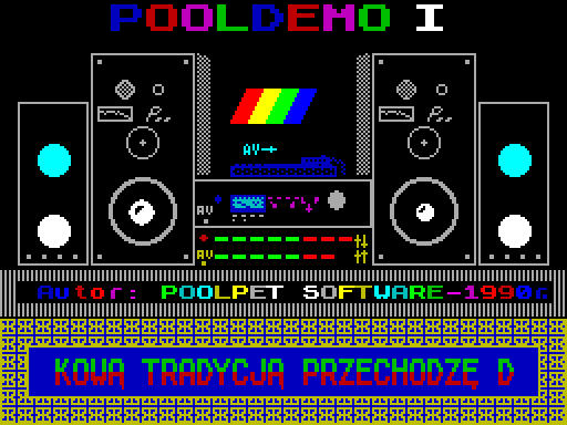Играйте в Pooldemo I онлайн. Компо-демка, опубликованная в Польше в 1990 году командой Poolpet Software, которую разработал Wojciech Lazarski.