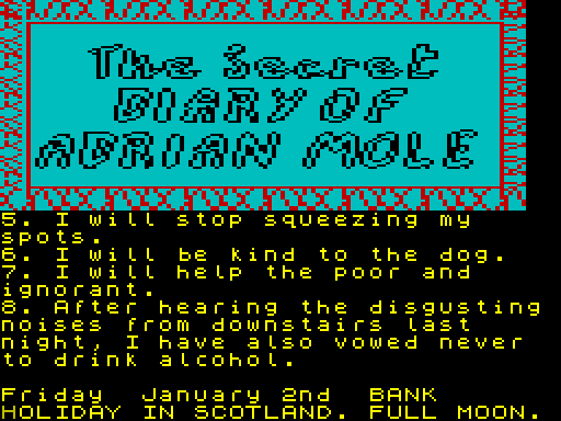 Тайный дневник Адриана Моль возрасте 13 3/4? Компьютерная игра впервые опубликована в Великобритании 1985 года Mosaic Publishing Ltd, 187 Upper Street, London N1 1RQ