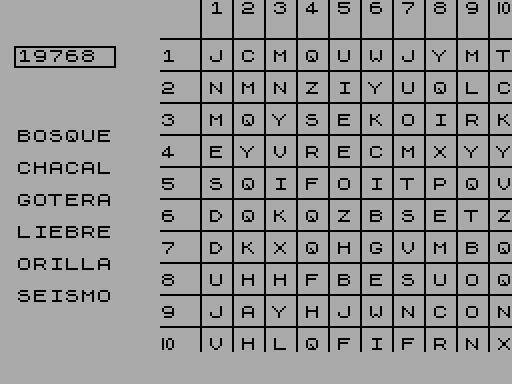 Можете начать играть в Sopa de Letras [1] онлайн. Логическая игра, которую подарил миру Miguel Samplon, была выпущена творческой группой MicroHobby в 1985 году в Испании.