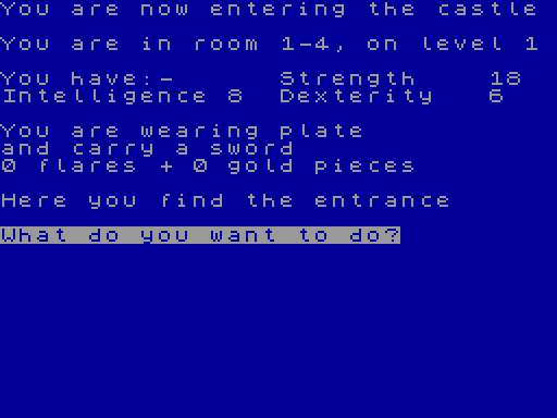 Первая часть игры позволяет выбрать, какой тип характера вы хотите играть, а затем одеть себя для выполнения этой задачи перед вами. Вы можете купить доспехи, оружие и лампа или ракеты. Все входы полностью соответствующего запроса. После того, как в замке, у вас есть несколько вариантов. Каждый выбирается один ключ, нет необходимости нажимать кнопку ENTER. Вы можете бродить по замку с помощью N, S, E, W, U и D для севера, юга, востока, запада, вверх и вниз. (Не Пресс н, когда вы находитесь у входа, если вы не хотите, чтобы покинуть замок). Вы встретите много странных и чудесных объектов в замке. Есть книги и сундуки можно открыть их в своих интересах – или недостаток! Ты будешь найти хрустальные шары, в которых можно смотреть, и видеть то, что, возможно, вы не должны видеть … Пить из бассейнов вы найдете и странные вещи могут случиться.