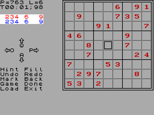 The key feature of this version is a huge database containing over 6,000 pre-installed puzzles of varying difficulty levels. This is a virtually inexhaustible supply of tasks for Sudoku lovers. The game is made in monochrome graphics mode (only the border is attributed), which is typical for many late homebrew releases for the Spectrum, and focuses on pure gameplay, offering a convenient and functional interface.