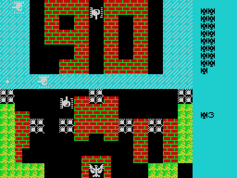 Gameplay: The player controls a single tank on a limited field strewn with destructible and indestructible obstacles (concrete blocks, brick walls, water, forest). The goal is to destroy all enemies in the level while protecting your base (often in the form of an eagle or a sign) from enemy projectiles.