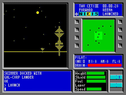The skimmer operates in two modes, flight mode and ground mode. In flight mode control of the program is via single keys or a joystick. In ground mode you are in direct communication with the crafts computer via the computer window. On loading, the program will go into a demo sequence. To stop the demo press BREAK.