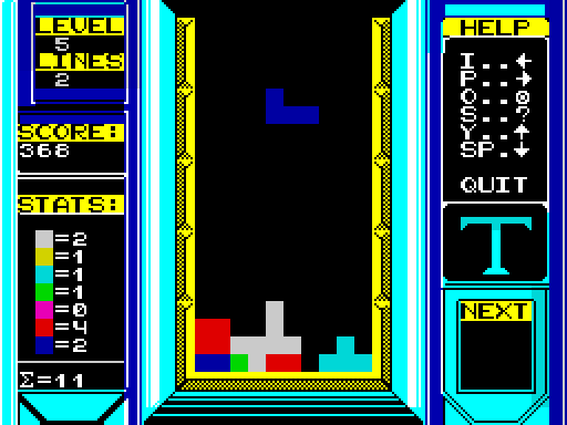 The statistics box at the left of the screen shows the number of shapes of different colours that have been positioned, and another box at the bottom right shows what shape of block will appear next. There are ten skill levels; the higher the level, the faster the blocks fall.