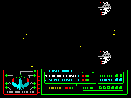 Shields and Lives: The ship was equipped with a shield system. Shields were lost when hit, and only after they were completely depleted was the ship destroyed. The player had a limited number of lives (ships).