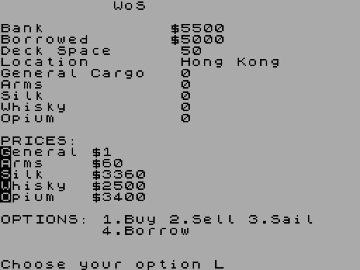 графика, “Redhawk” – стиль, но прежде чем я уйду, я буду держать обещание, которое я дал в предыдущей статье, и поставить простой программы “Королевство” вид для тех, кто хочет что-то, чтобы работать, чтобы использовать в качестве Водитель своей графикой. Перечень приведен в программе 3 [файл: Трейдер]. Цель игры состоит в том, чтобы накопить # 100000 по проницательный, если несколько теневых практик торговых. Сценарий Южно-Китайского Моря, но может быть так же легко, контрабанды вдоль побережья Корнуолла, или что-то. Ваш корабль может вместить 50 единиц груза, покупка / цена продажи, которая колеблется. Вы начинаете с # 500 из ваших собственных, плюс # 5000 вы заняли и в конечном итоге должны заплатить. Интерес добавляется в этот всякий раз, когда вы меняете порты. Ах, да. Вы можете столкнуться с штормы в пути и потерять часть груза.