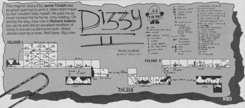On the title screen hold down POA, then press Enter and hold it down until the game starts. By pressing C you can make Dizzy disappear. You can now use Z, X, K and M to select the screen you want and press Space to start on that screen. Take care though, as you reappear in the same part of the screen, and you don’t want to land in the water do you?