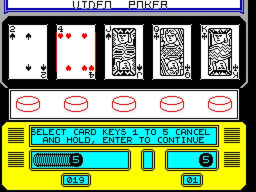 Симулятор покера для ZX Spectrum от британской студии Entertainment USA, выпущенный в 1986 году. Игра воспроизводит механику казино-автоматов с базовыми правилами пятикарточного видеопокера: игрок делает ставки, получает карты и собирает выигрышные комбинации (пара, флеш, стрит и др.).