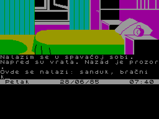 Это приключение полностью в “реальном времени” – то есть, каждый из ваших действий будет принимать больше или меньше времени, все персонажи в игре будут выполнять свои обязанности, как проходит время и так на непрерывную информацию о времени и дате в ходе игры вы должны разделены. Граница между верхней и нижней части экрана. Это очень важно, чтобы постоянно наблюдать vremnu и дату. И если Srecko везде поздно, мероприятия начнутся разворачиваться неблагоприятно для него. Каждый раз, когда вы начинаете новую игру, некоторые мероприятия пройдут в разное время. Необходимо убедиться, что вы найдете в Перу кафе в 22 часов, если вы можете найти в последний раз там в то время. Любые действия “споры” определенное количество времени для выполнения. Поиск медленные потоки, если вы ничего не делаете. Но не забывайте, в то время как вы и Srecko ничего не делать, то игра происходит в комплексе мероприятий механизма, который никогда не останавливается. Даже в то время Srecko спит. Не удивляйтесь, если некоторые вещи происходят даже при вводе нового сообщения для вашего героя!