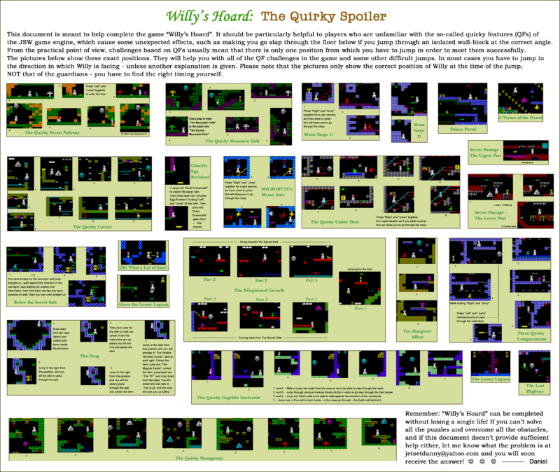 Эндрю также заслуживает похвалы за некоторые из модификаций игрового движка (в разделе «Технические Notes” ниже) и особую благодарность и признательность за его выдающуюся роль в развитии Jet Set Willy и Manic Miner игры и сообщества JSW / ММ.