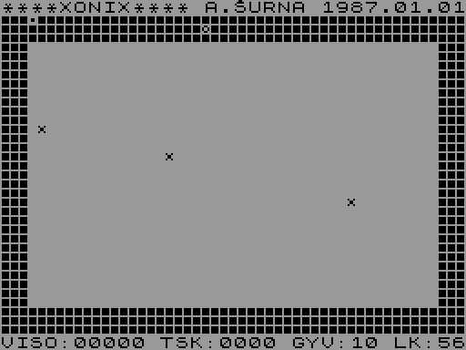 Xonix» – это классическая аркадная игра, созданная литовским программистом А. Сурной (A. Surna) в 1987 году для ZX Spectrum. Игра является адаптацией популярной одноимённой головоломки, изначально выпущенной в 1984 году для компьютеров под DOS. В версии для ZX Spectrum сохранена основная механика оригинальной игры, но с некоторыми особенностями, характерными для платформы.