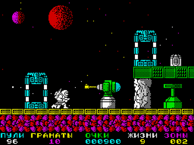 Игрушка Exolon – это один из шедевров игрового девелопинга на платформе ZX Spectrum. Великолепная графика, звук, сценарий и приятные глазу локации (всего их 125 штук) будут радовать вас и проверять мастерство ваших шустрых пальцев. Несмотря на кажущуюся простоту в начале, игра с каждым следующим экраном становится всё сложнее и сложнее. К счастью в нашем эмуляторе игру можно сохранять в любом месте, что позволит вам рано или поздно пройти игру полностью.