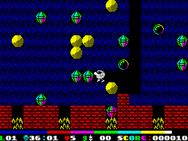 На спектруме данная идея получила широкое развитие в виде игры Boulder Dash, которая включала в себя 3 части. Но популярные игры тем и отличаются от обычных, что их клонируют, развивают и всячески переделывают. Одним из таких развитий Boulder Dash’а стала игра Earth Shaker Майкла Бэтти (Michael Batty). Наряду с весьма симпатичной графикой Майклу удалось сделать довольно приятную музыку и создать 30 совершенно разных уровней, в каждом из которых есть своя “фишка”. Например, уже во втором уровне есть компьютер, разбив который можно убрать защитное поле, а в четвёртом уровне есть антигравитаторы, которые заставляют все камни, кристаллы и прочую “фурнитуру” лететь вверх. Музыка меняется каждые 5 уровней, а попасть в каждый уровень можно с самого начала, достаточно лишь ввести его название.